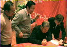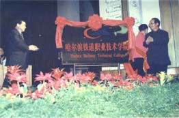原黑龙江省教育厅厅长、现省人大副主任董浩(左一)和三局集团公司原董事长刘成山(右一)为学院揭牌